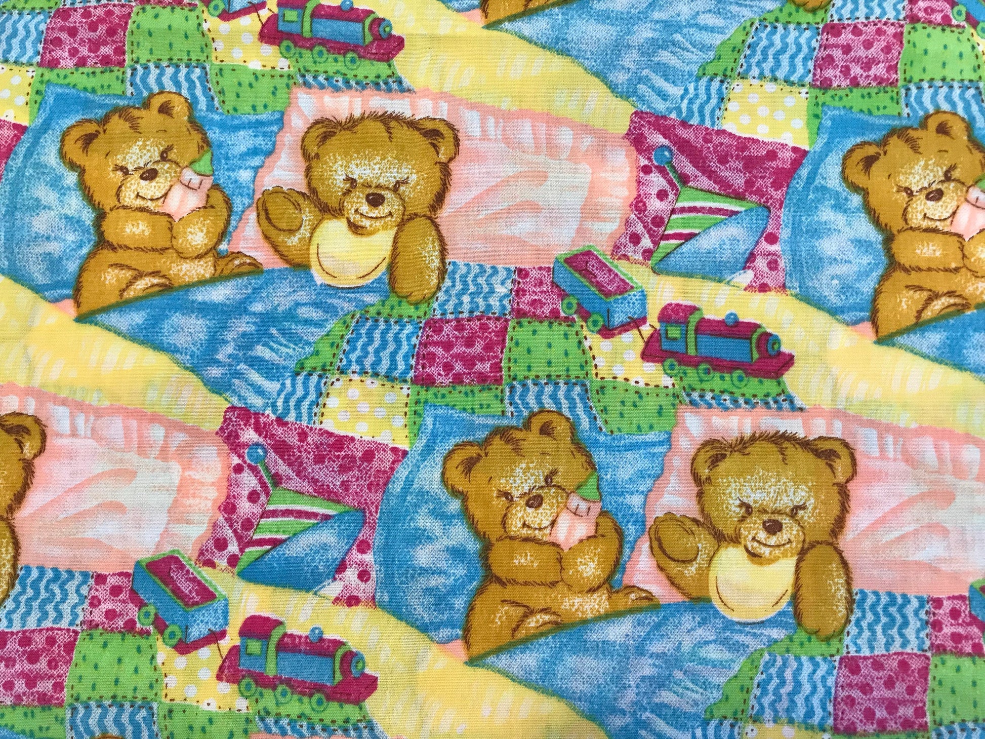 • This fabric is printed with baby teddy bears and abstract pink and blue prints
