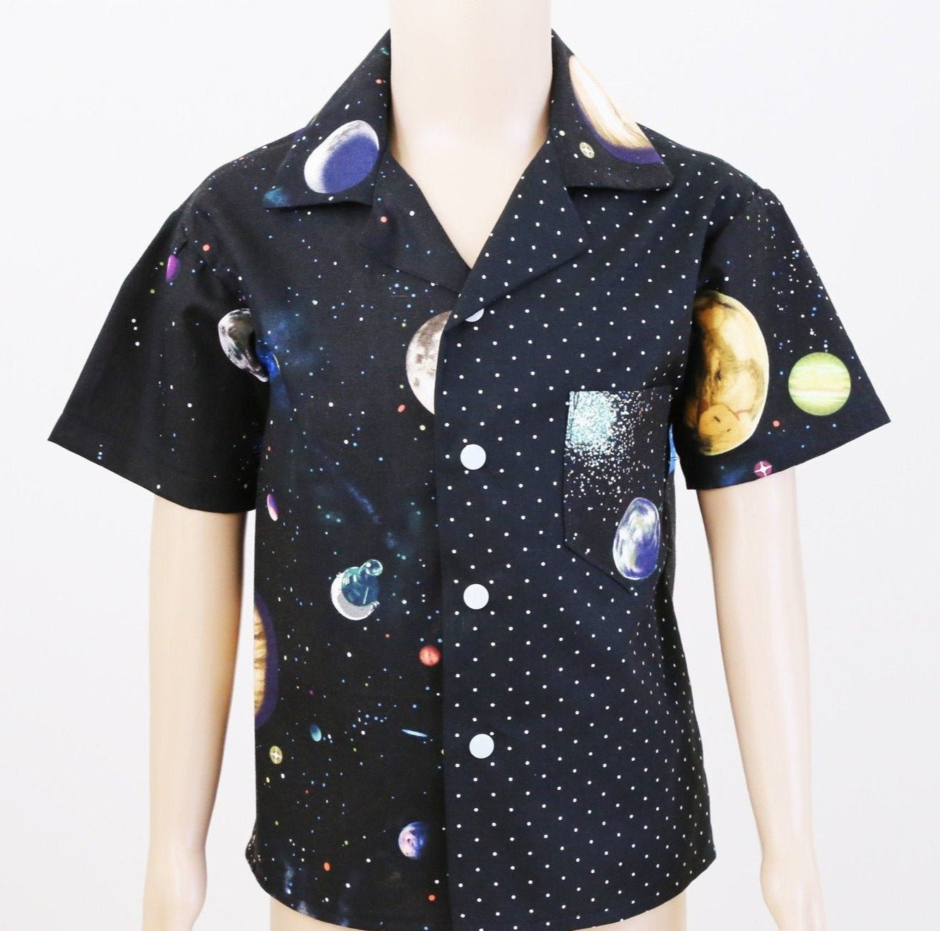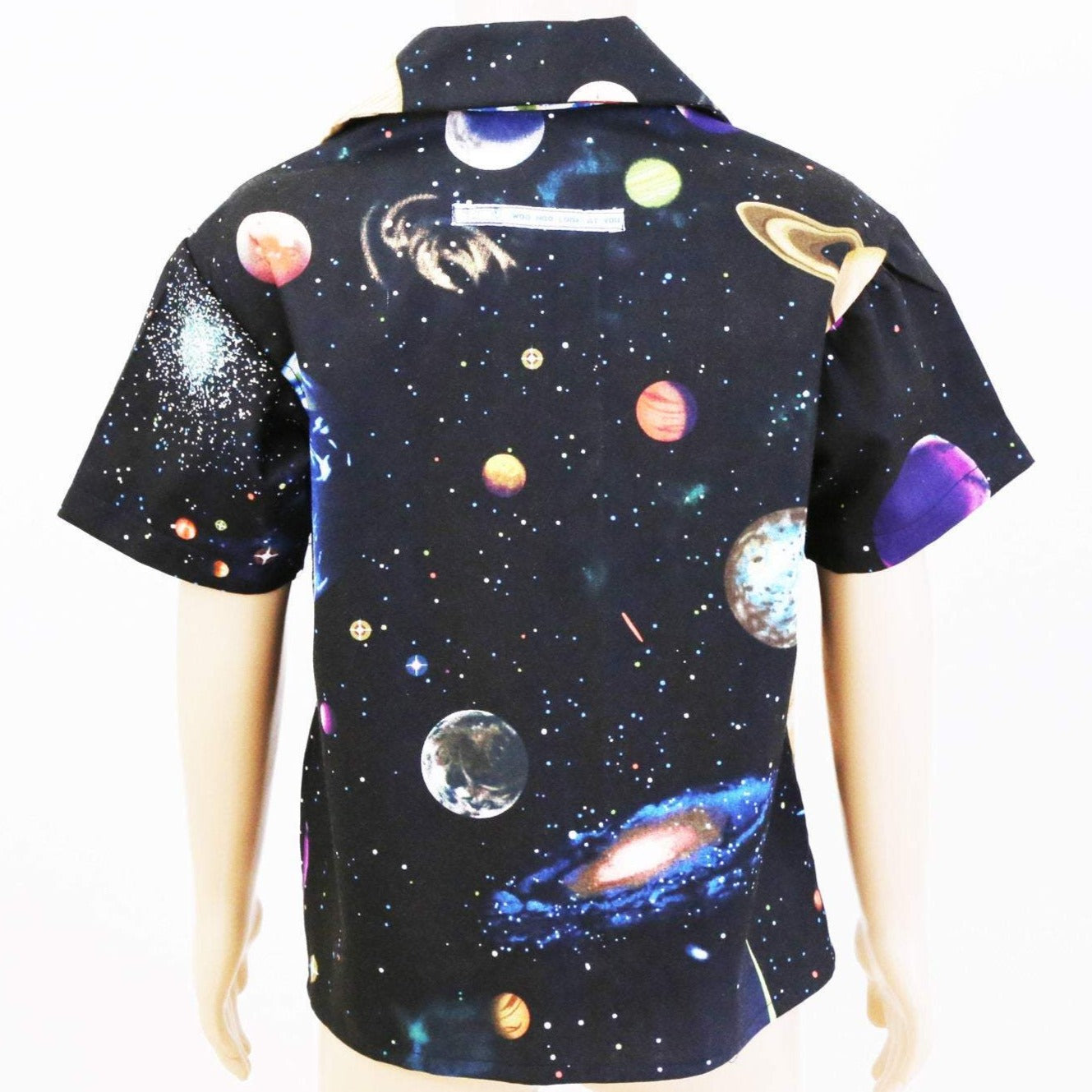 Shirt - Space Theme on Black with White Spot Contrasting Panel, Space Pocket