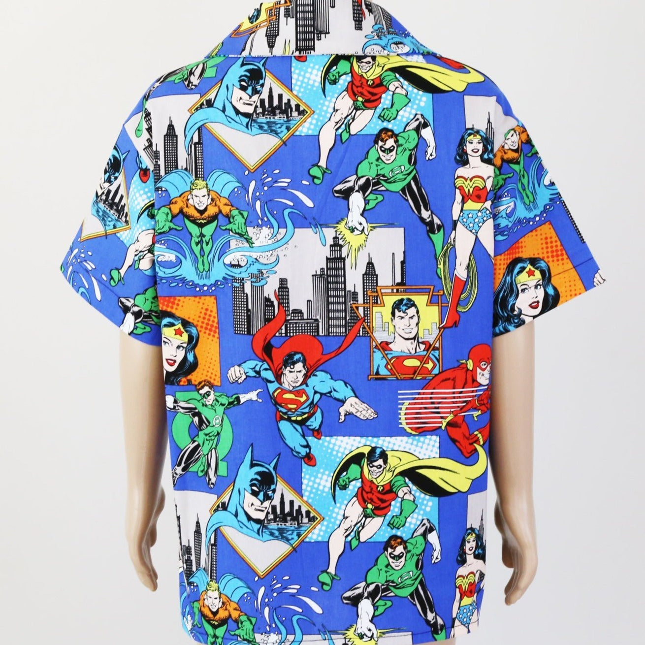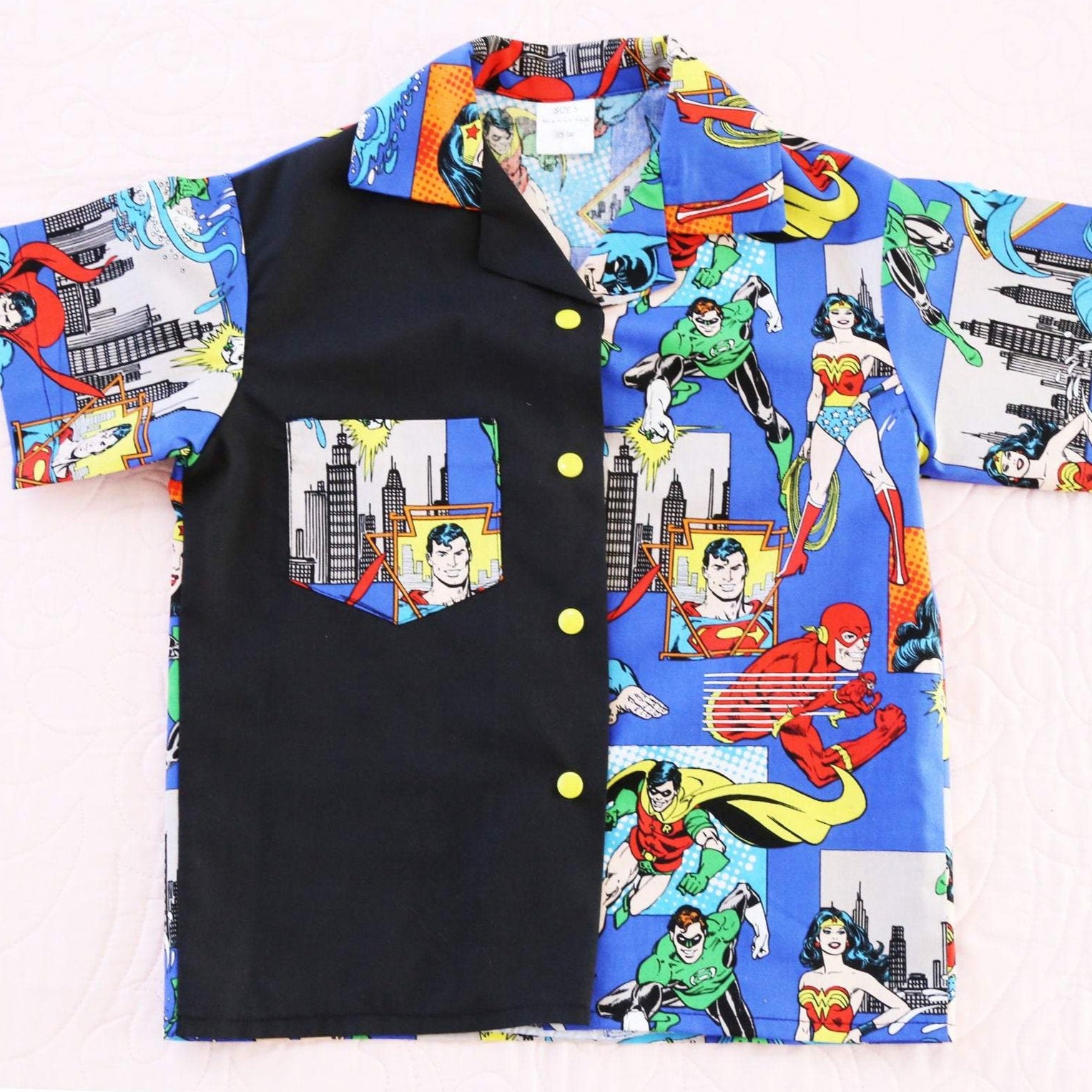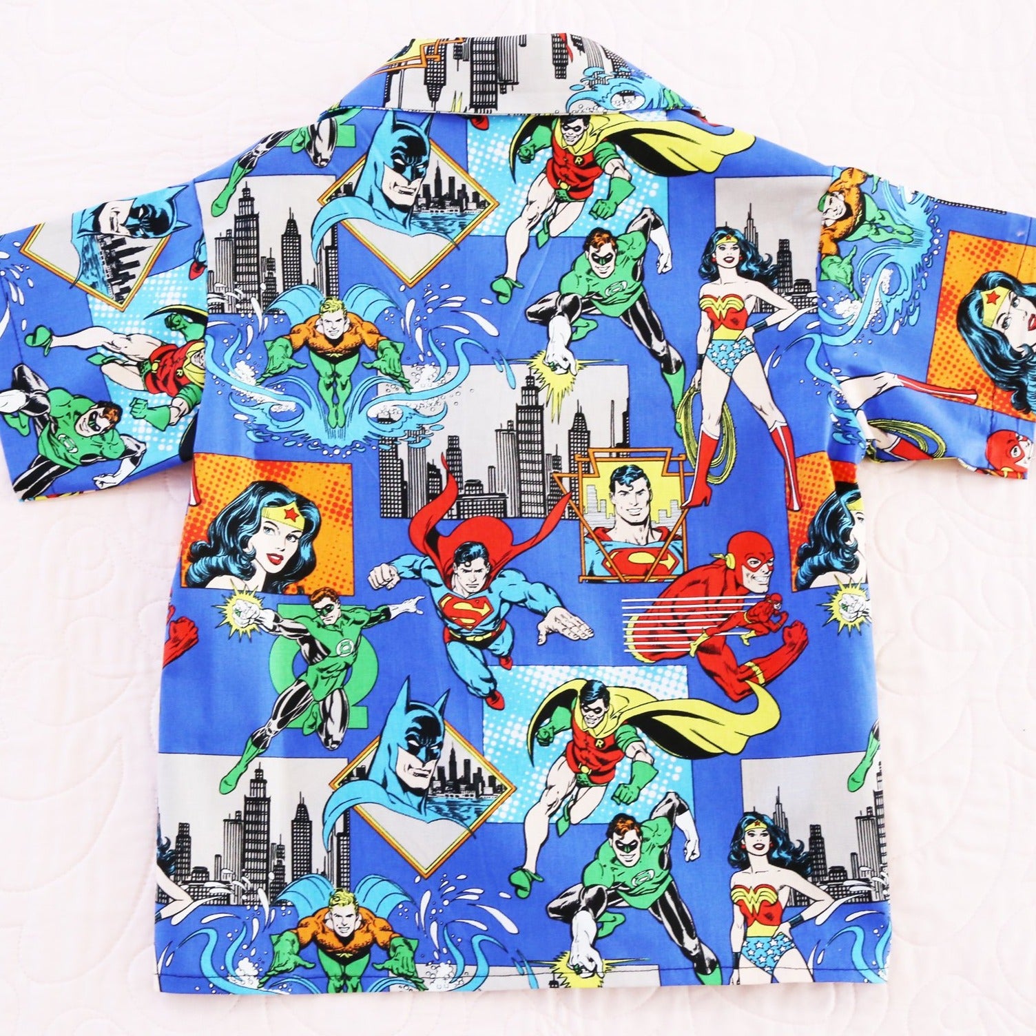 If your young boy is into superheros this shirt is for him. He will feel every bit the hero himself in this. The shirt has lots of pictures of superheros from the sea, the air and the ground. He will feel confident to fight any battle he faces. On the front half it is a complimenting plain fabric which has a pocket made of the superhero fabric. It has a snap button front. Pocket sides may vary.