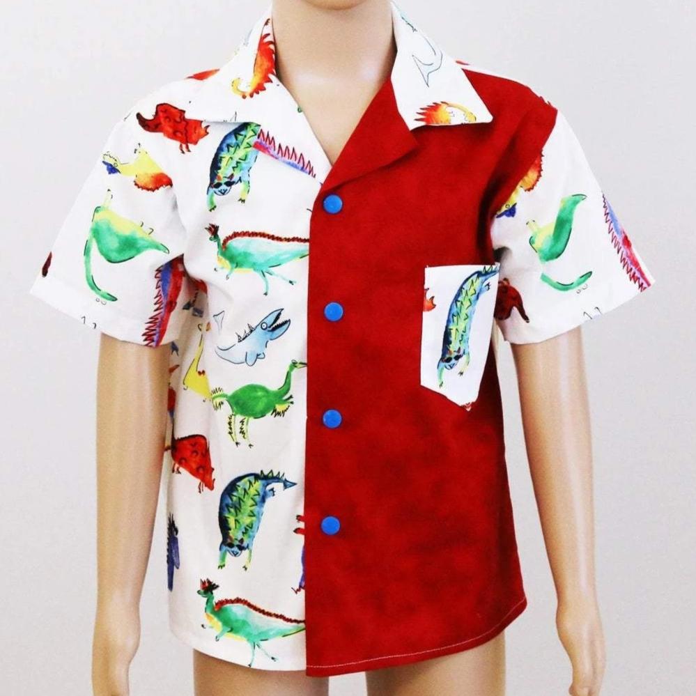 - Half of the shirt front has a basic red cotton trimmed with a pocket of the colourful dinosaur material