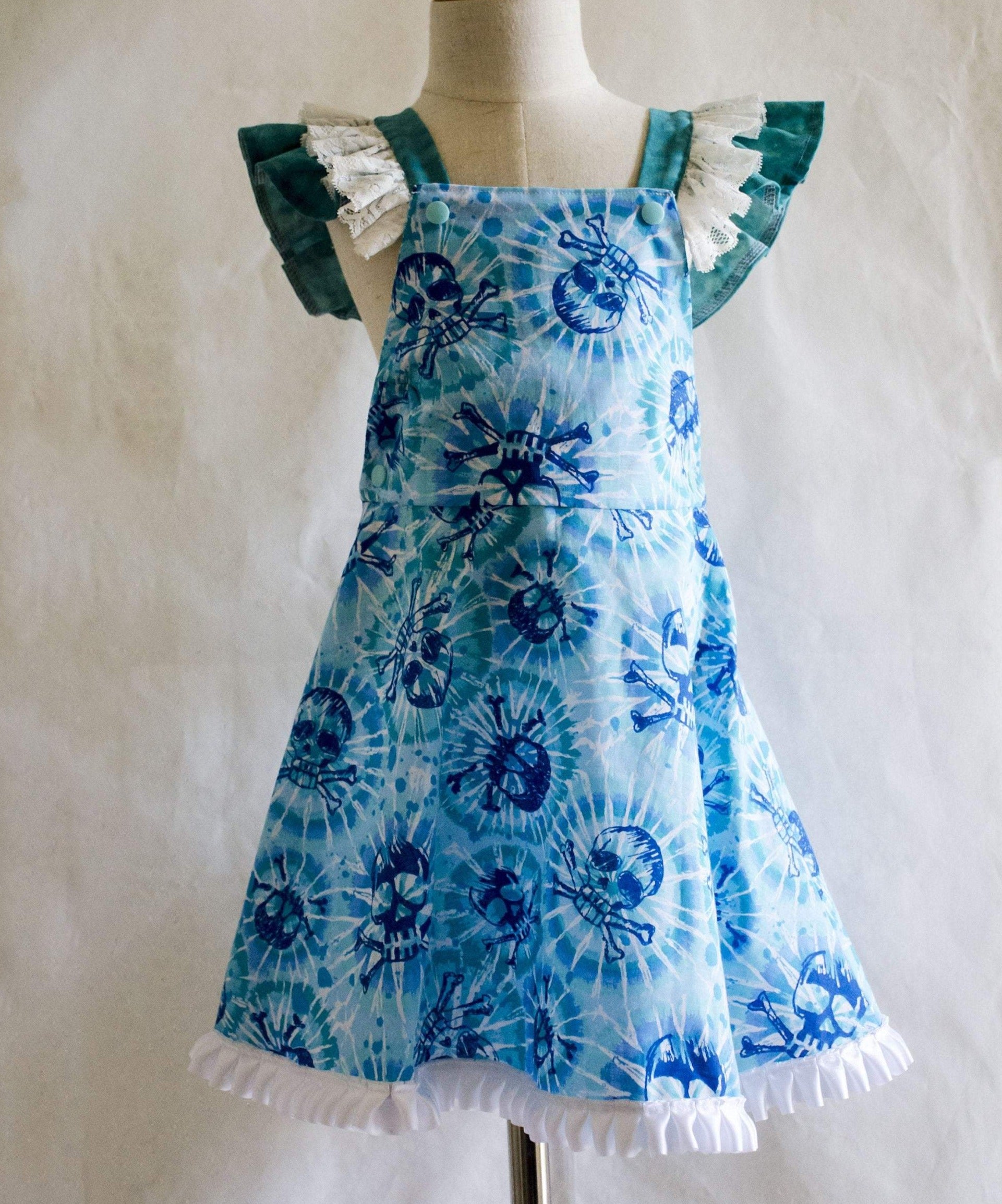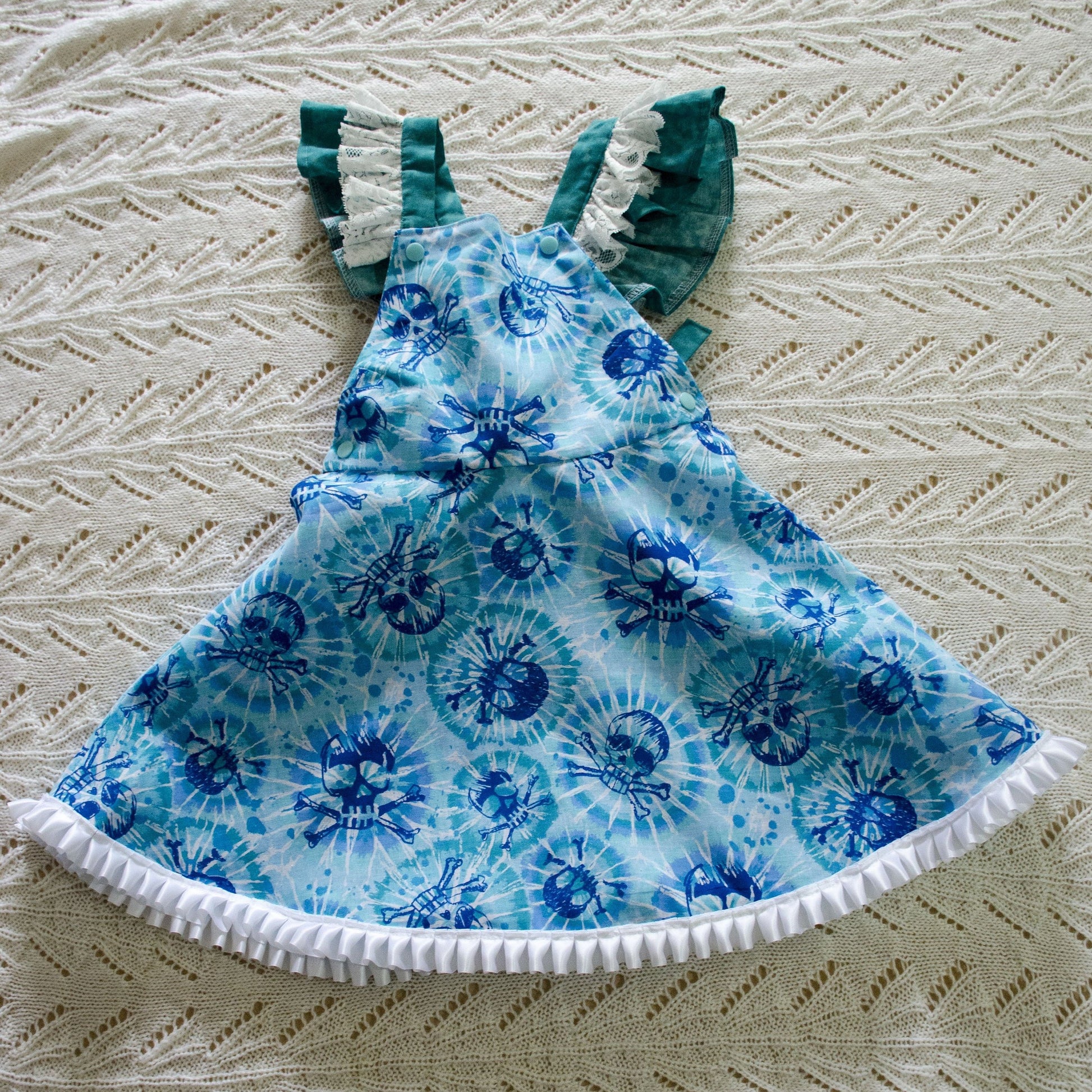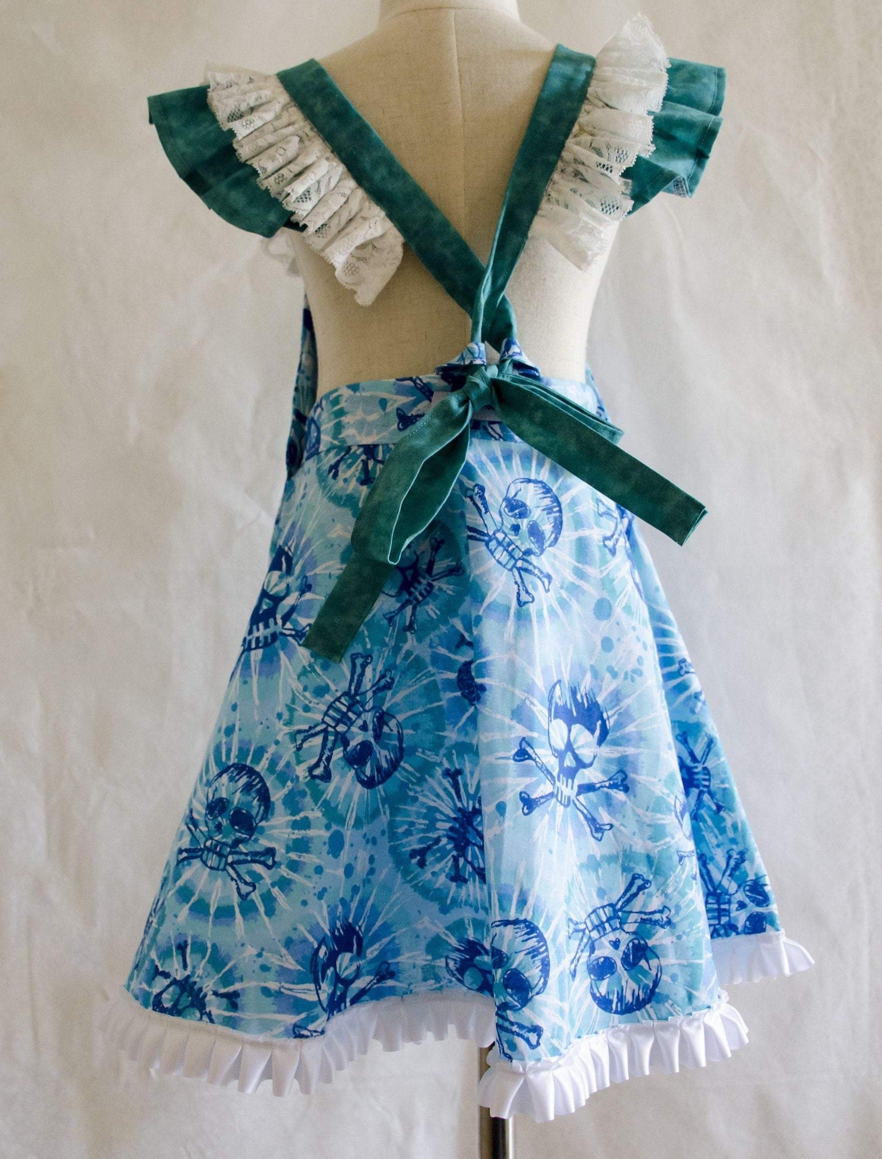 Dress - Halloween - Blue Skulls on a Tie Dye Cotton with Lace Trims