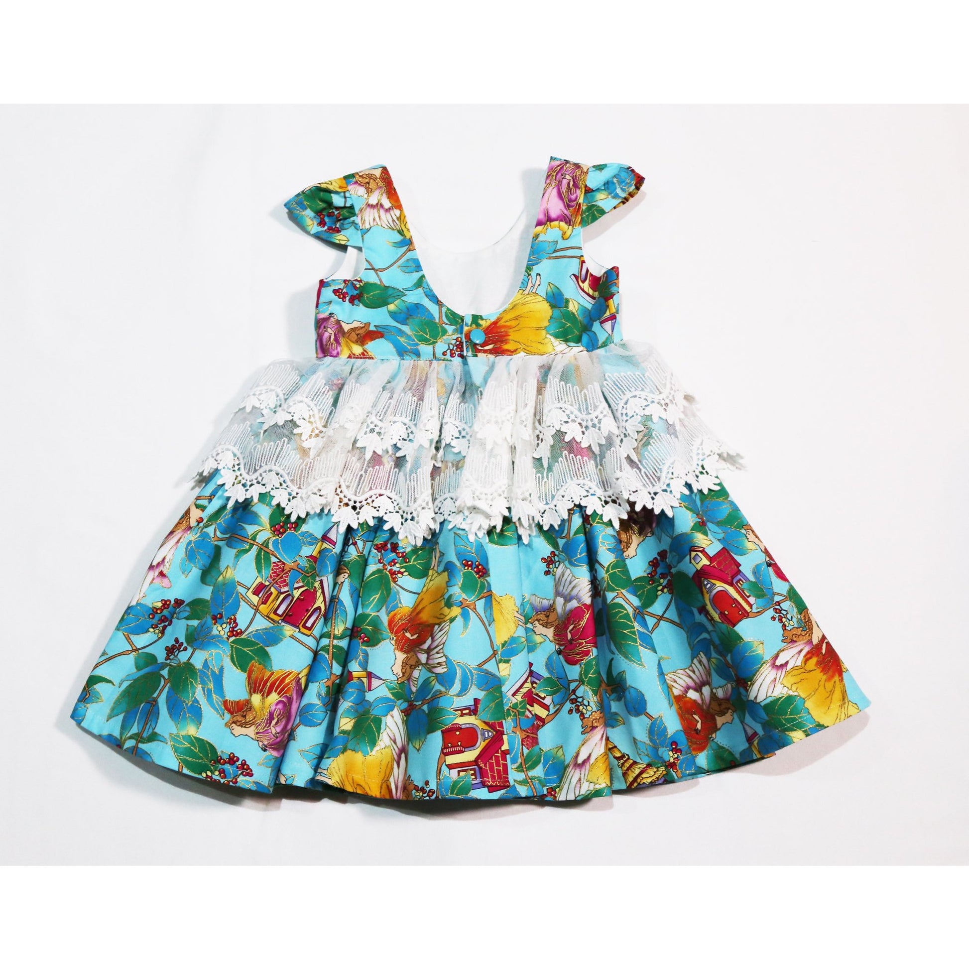 Dress - Capped Sleeves, Fairies on Teal Fabric, Lace on Waistline