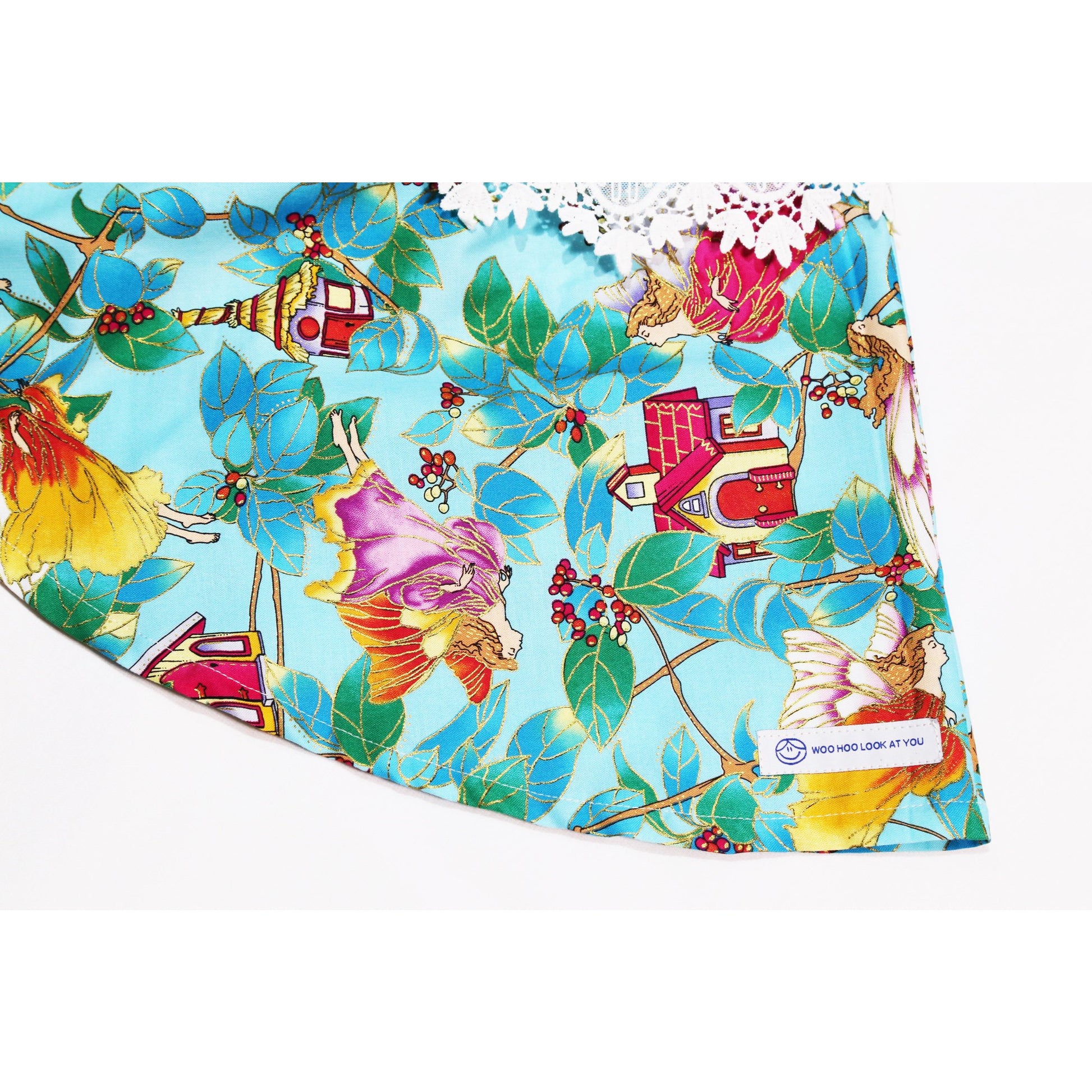 - fabric is is made up of varying shades of teal, with fairies flying amongst the the leaves and returning to their homes