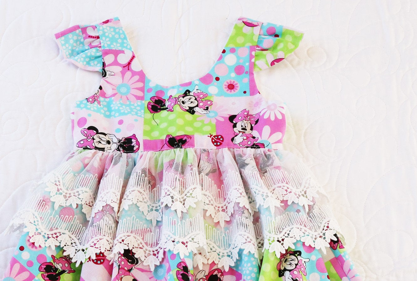 Dress - Capped Sleeves, Mouse and Daisies Fabric, Lace on Waistline