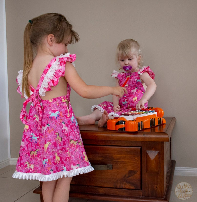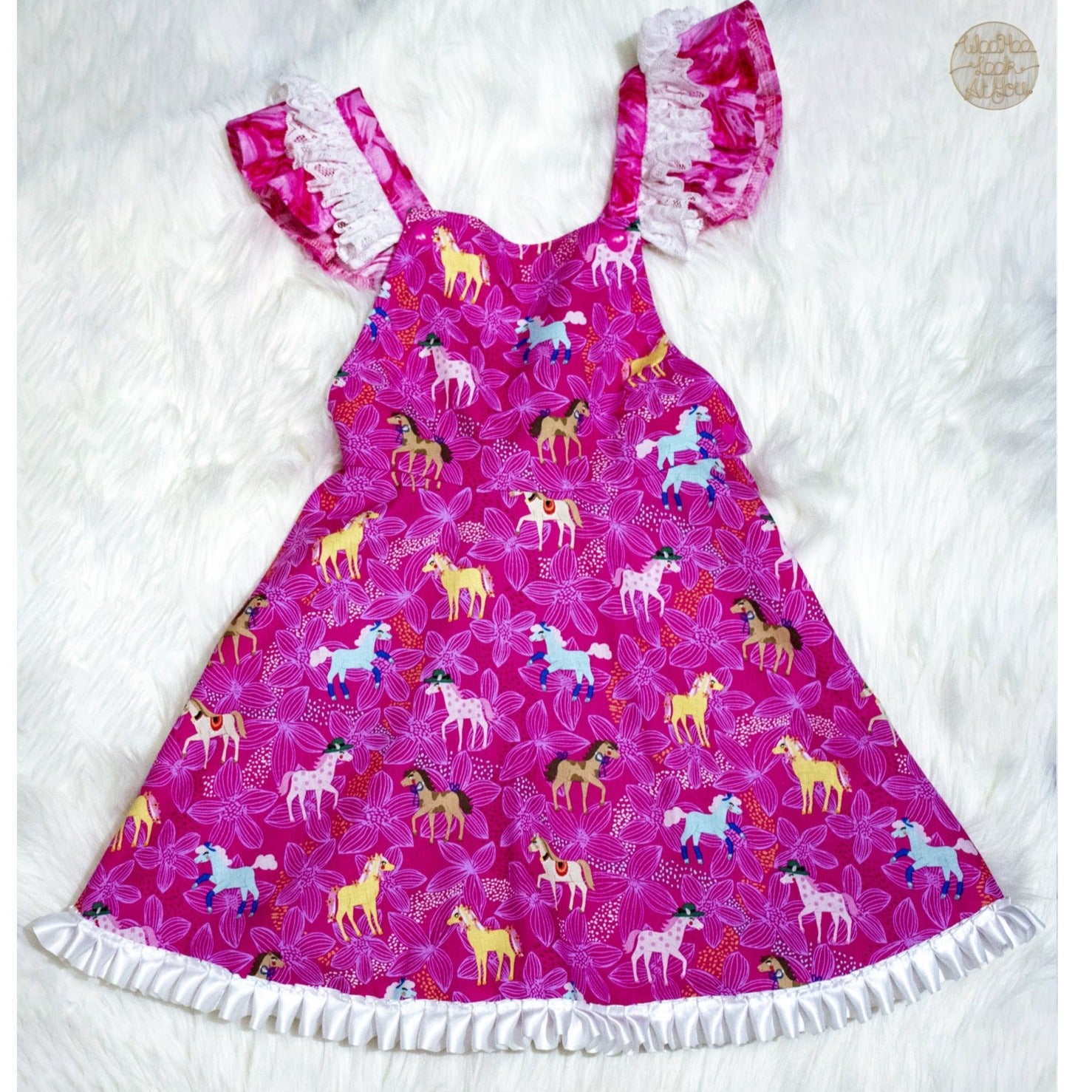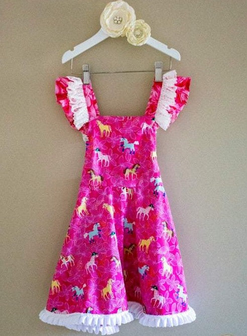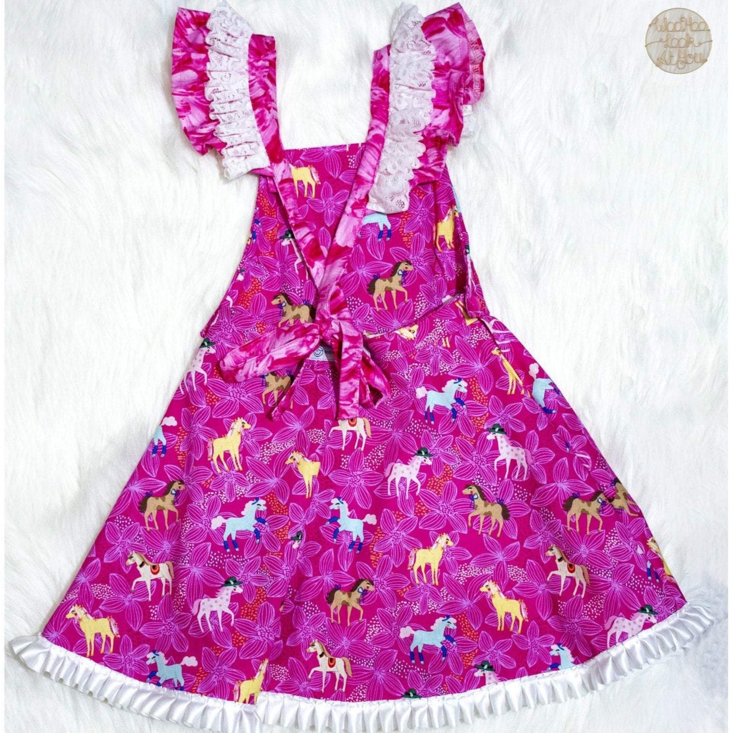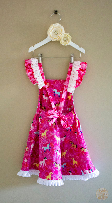 Dress - Pinafore - Prancing Horses on Pink with White Satin Trim