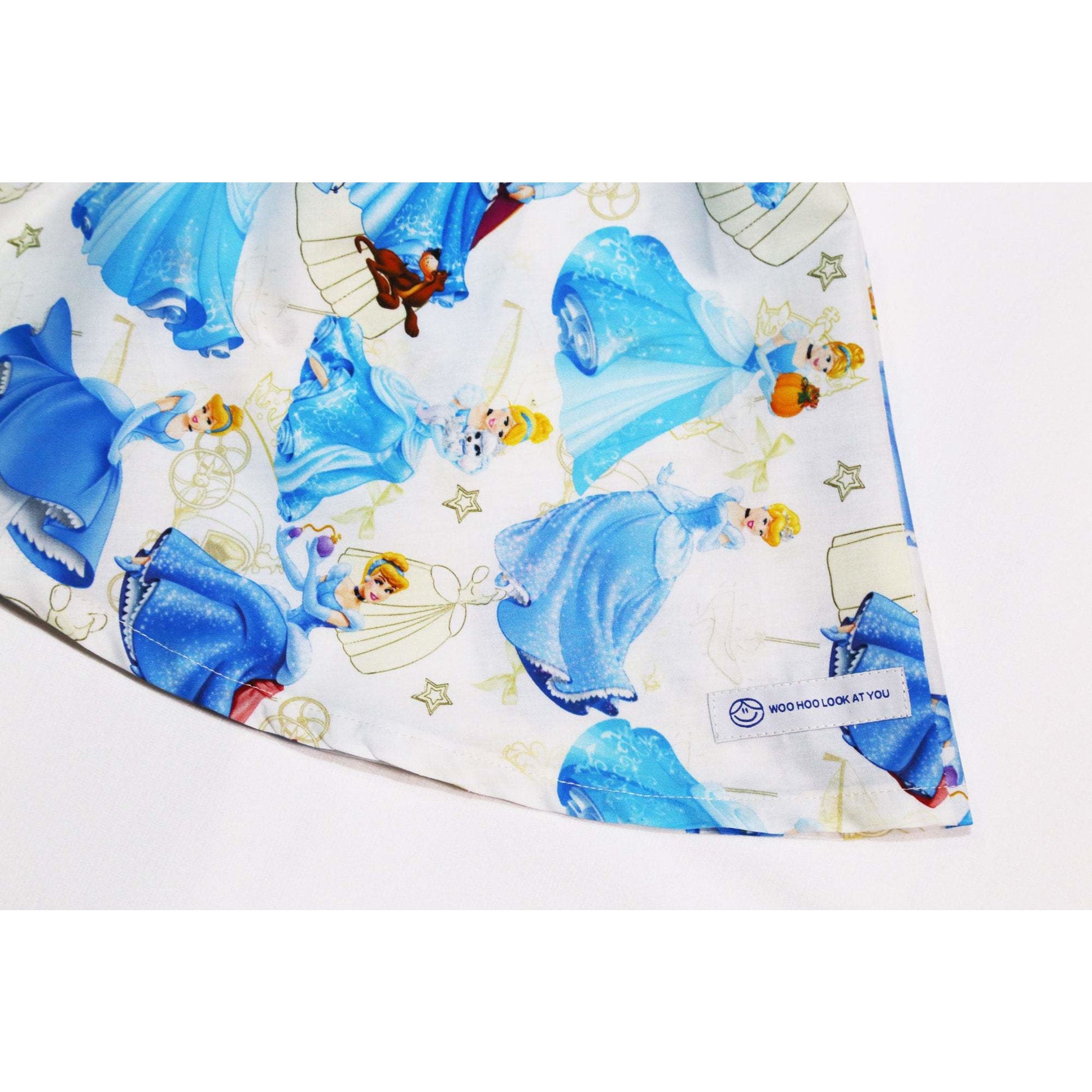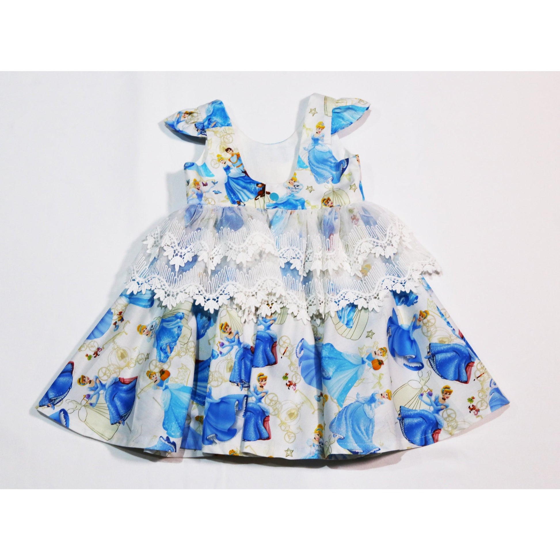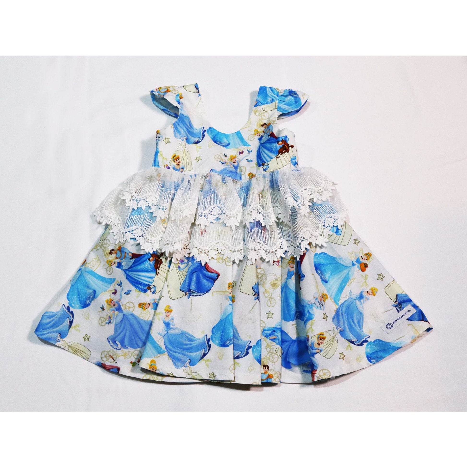 Dress - Capped Sleeves, Blue Princesses on White Fabric, Lace on Waistline