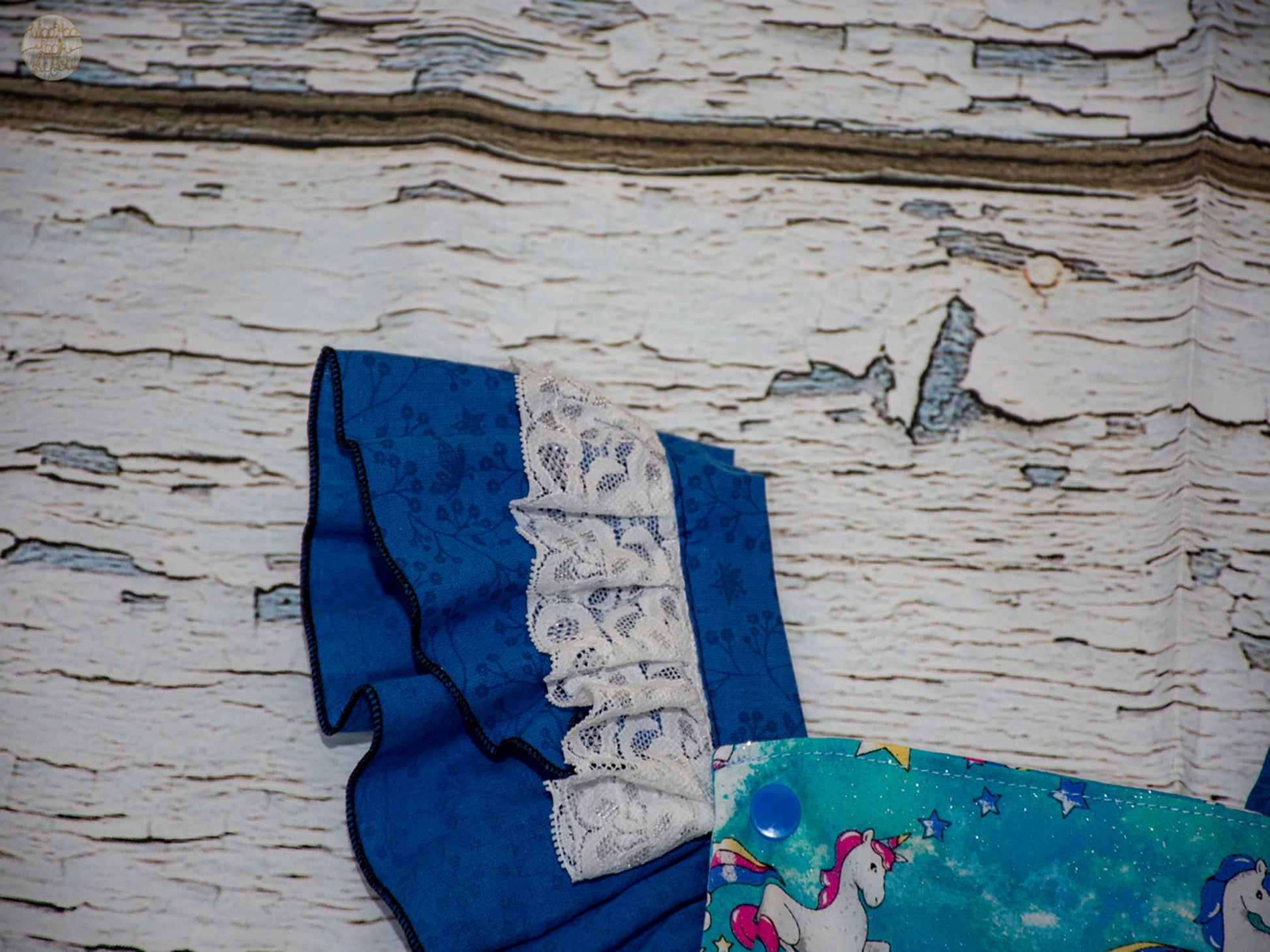 - shoulder ties have a gathered ruffle from a coordinating fabric with an overlying soft lace.