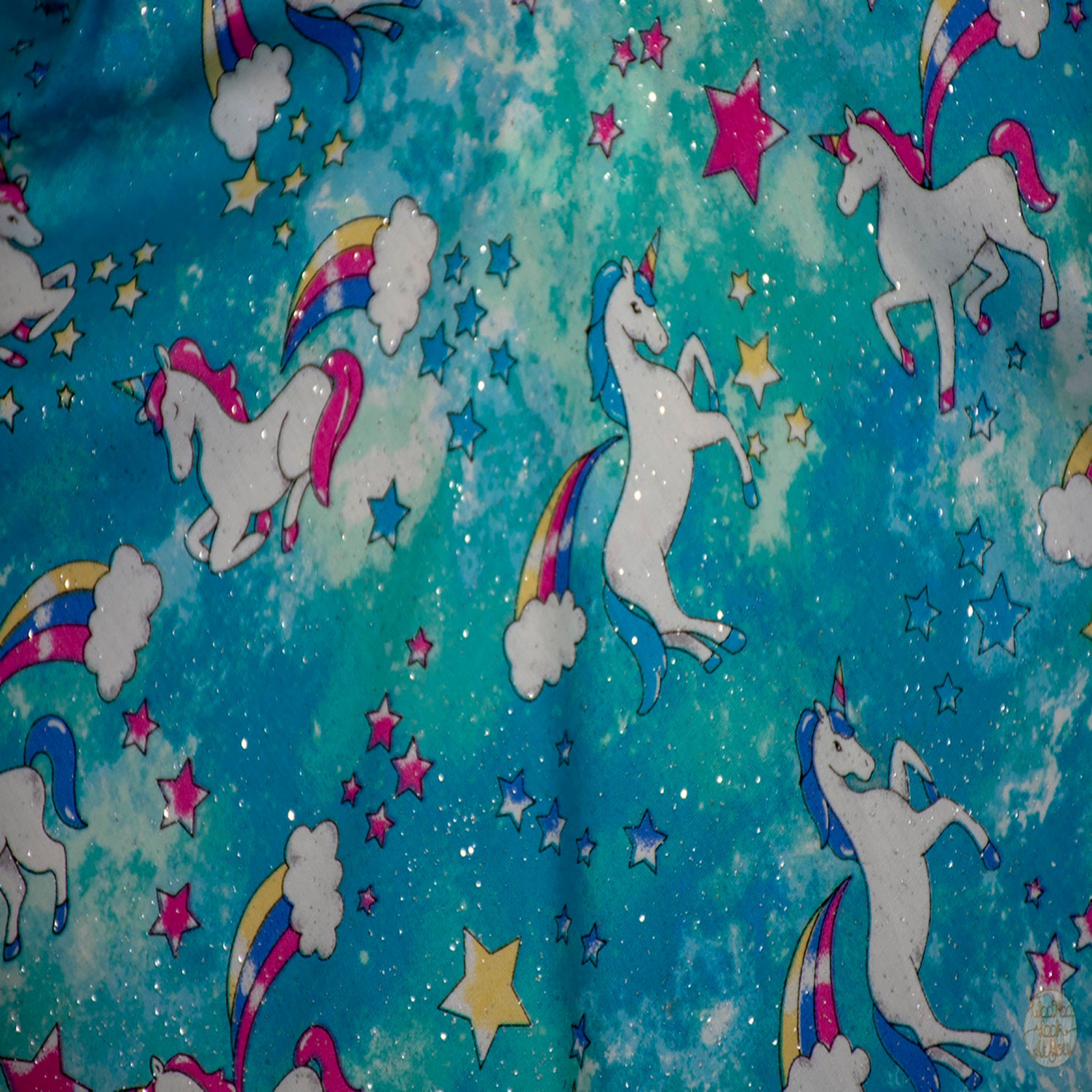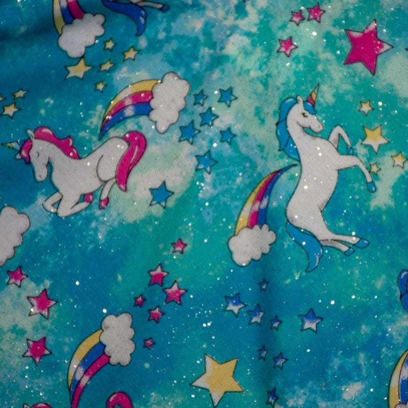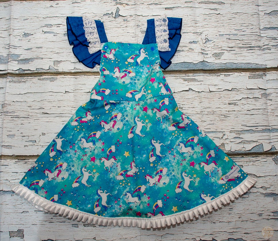 Dress - Pinafore - White Dancing Unicorns on Electric Blue with White Satin Trim