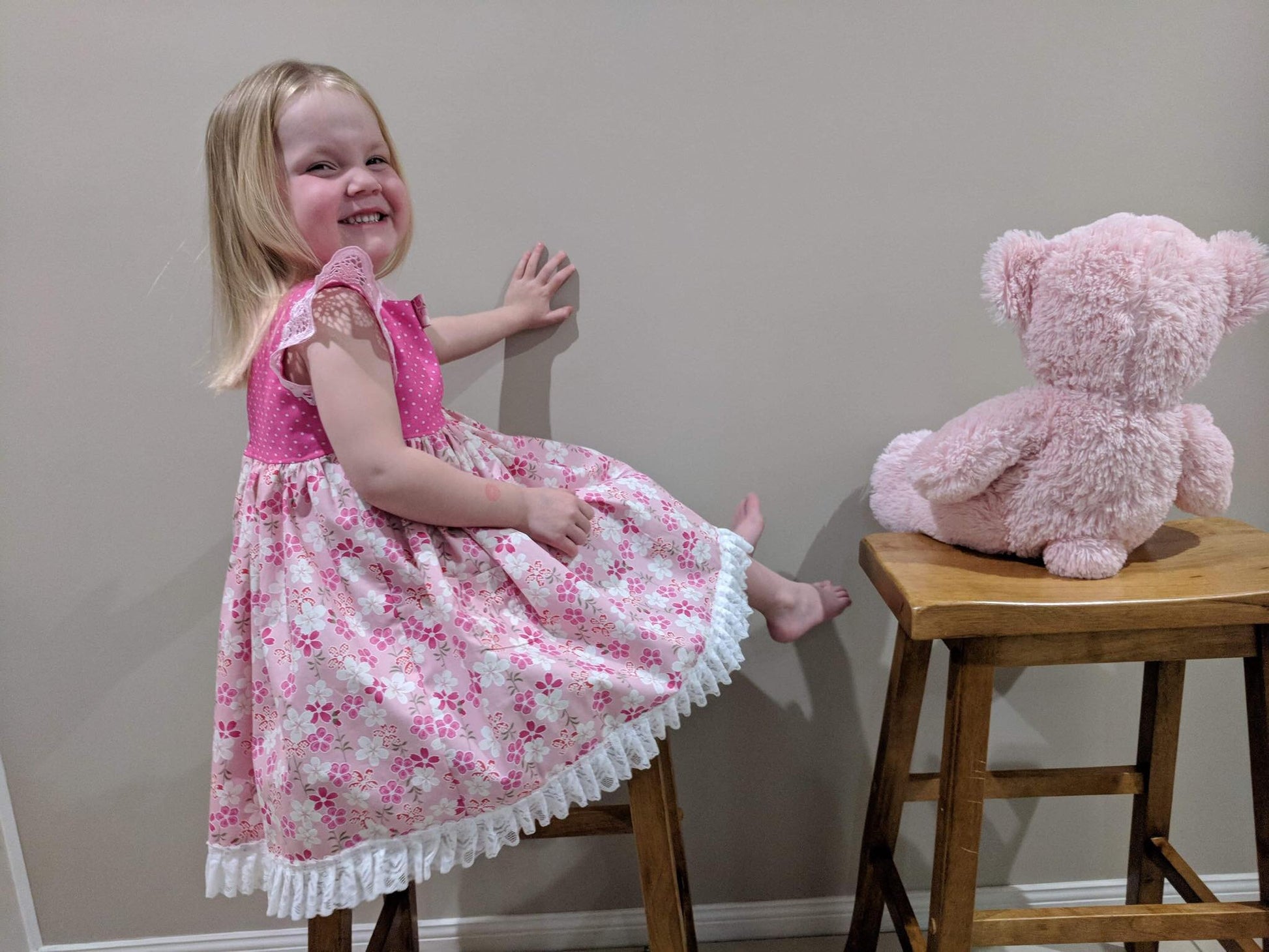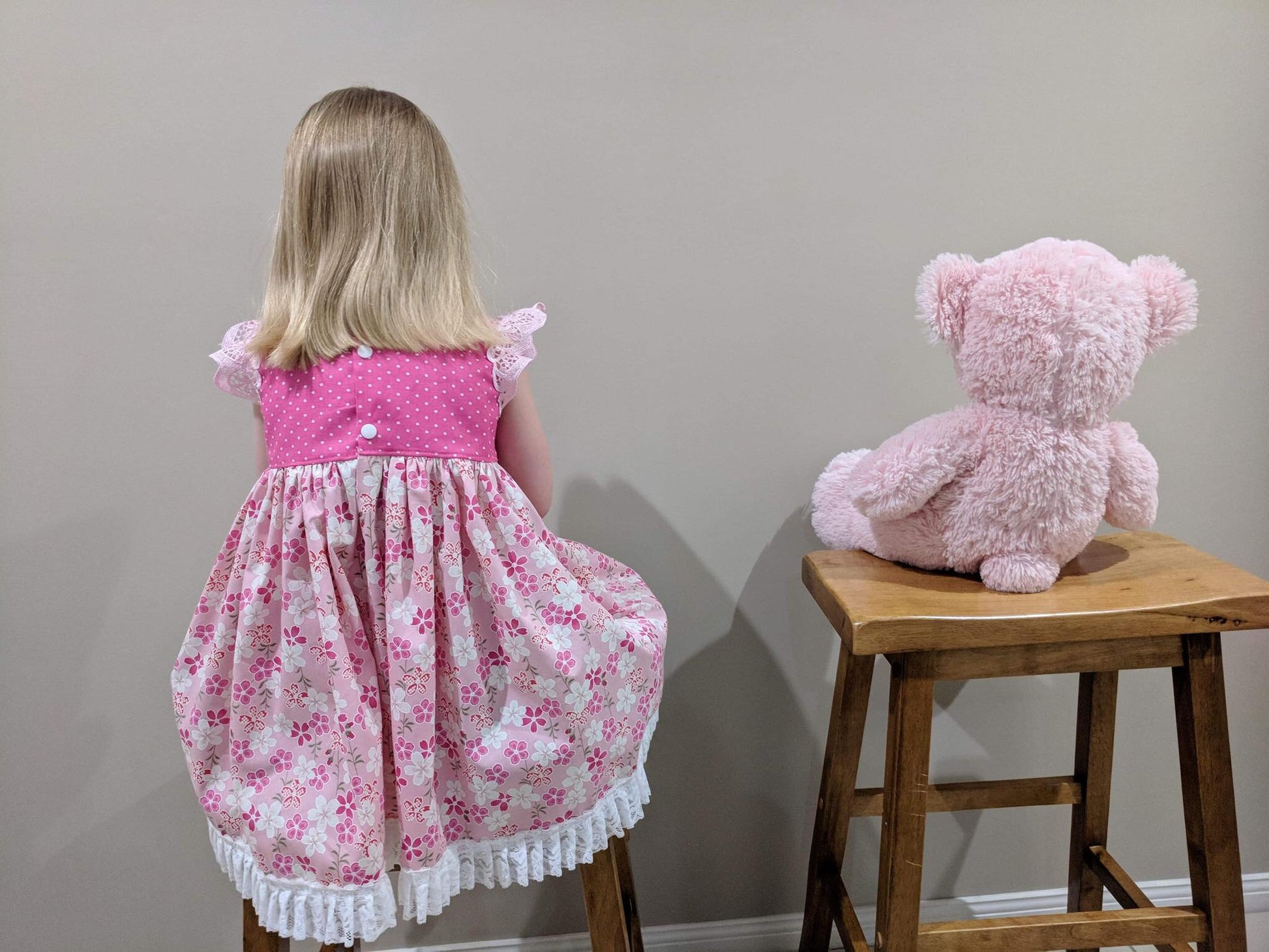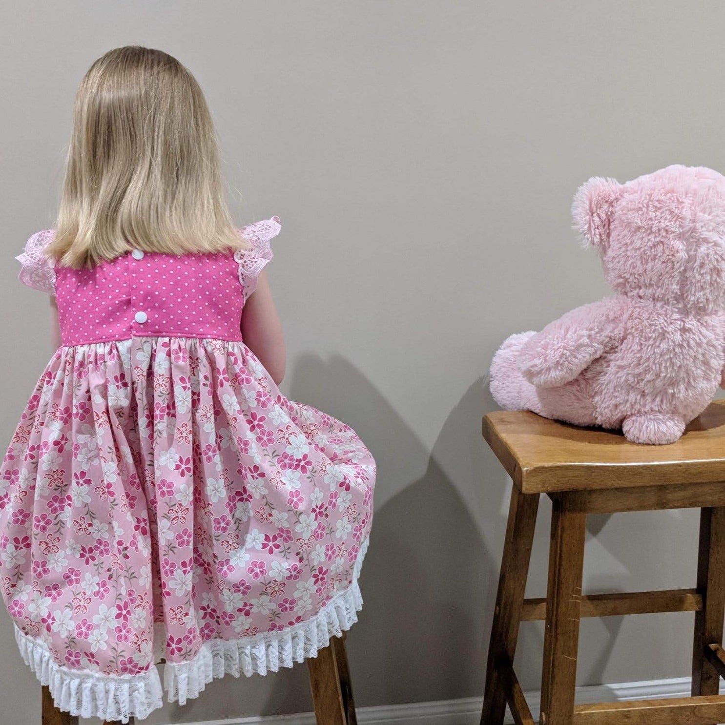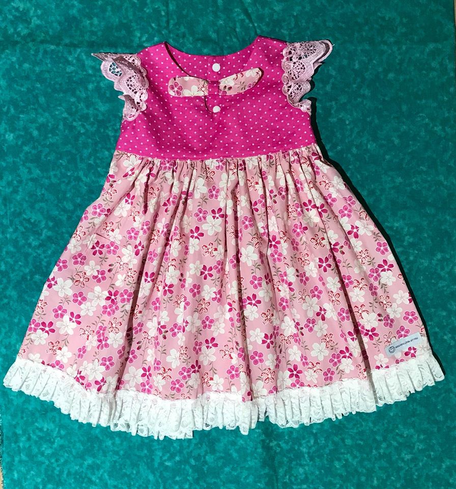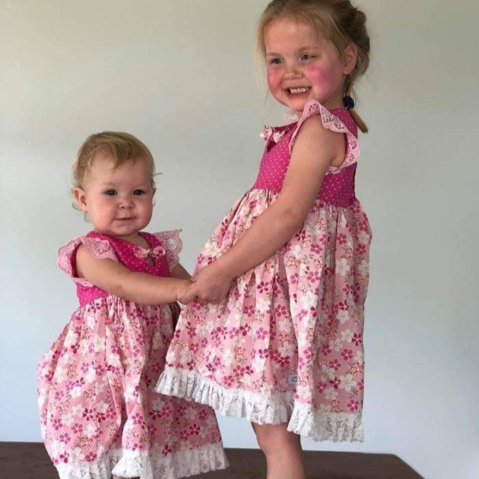 Dress - Maddie - Bright Pink Bodice, Pink Frangipani Skirt with Light Pink Lace Flutters and Lace/Pom Pom Hemline