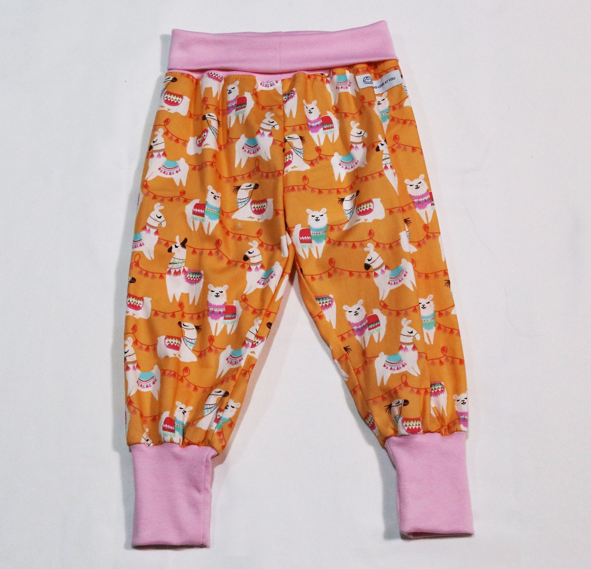 Pants - Harem - Ribbed Waist - Orange Llamas with Pink Bands