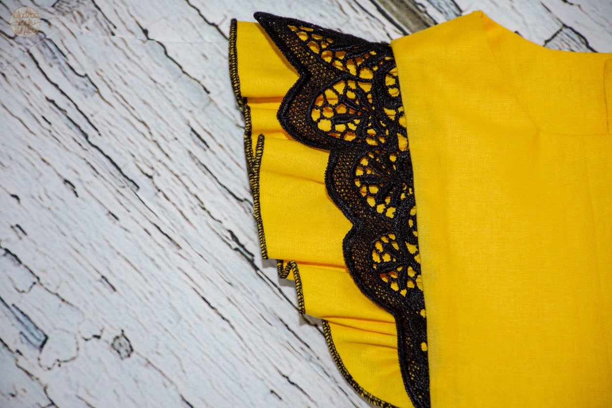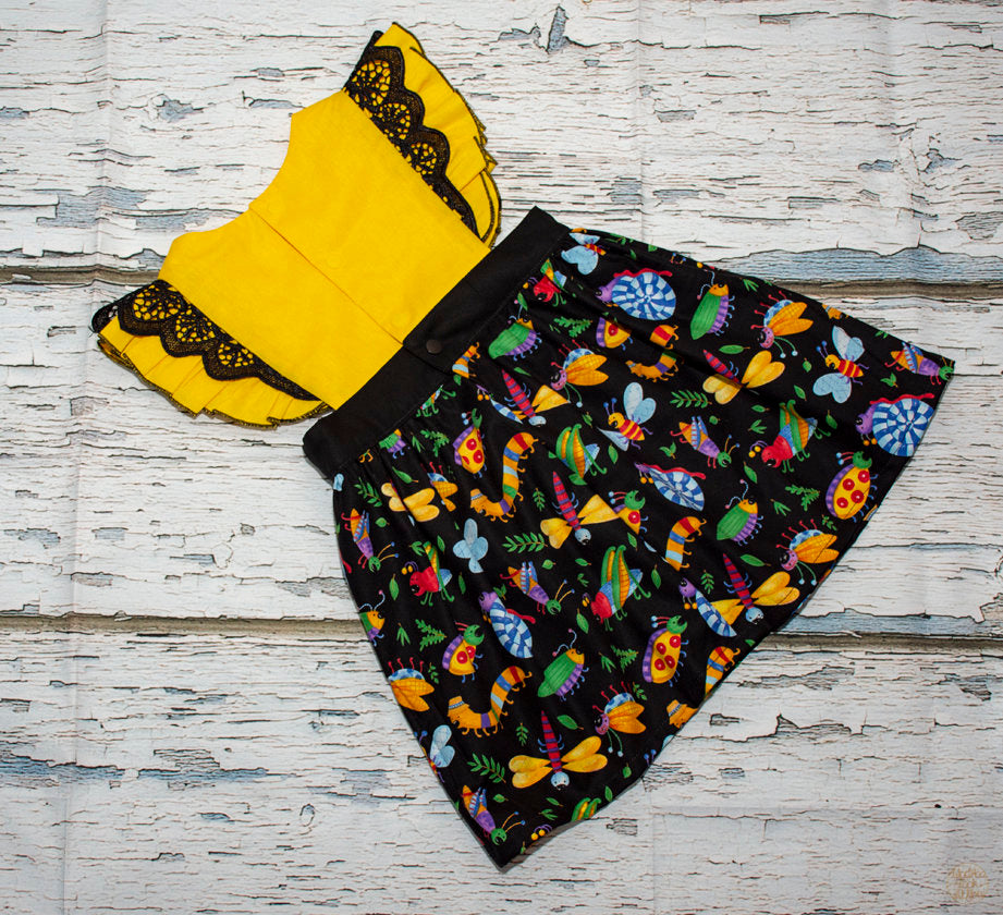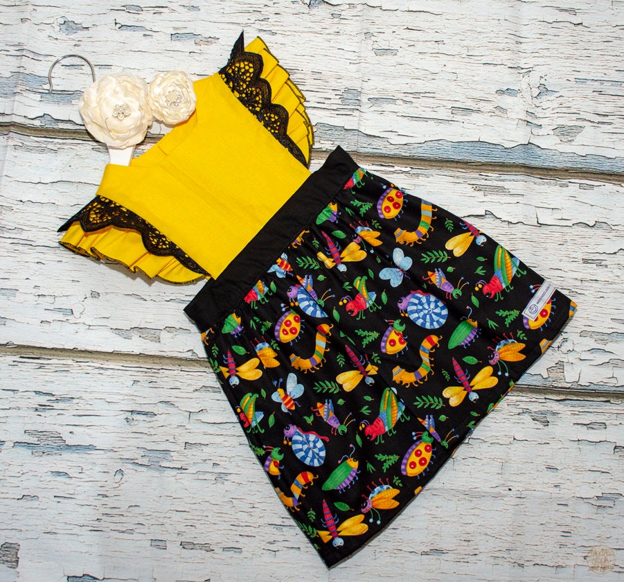 Gorgeous young girl's pinafore that would make any girl feel pretty and playful. Suitable for warm summer outing or in autumn with a long sleeve top underneath. Skirt is a full circle, with colourful bug print and is made of 100% premium cotton the gathered skirt on a fitted waistband is attached to a yellow square neckline bodice also in 100% cotton. The pinafore has snap button closing in matching colours at the back. It is trimmed beautifully with a delicate, black lace flutter over a yellow ruffle on the shoulder. This garment has been handmade with greatest attention to detail in finishing. It's easy care, with cold machine wash and low iron.