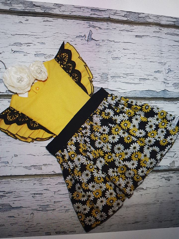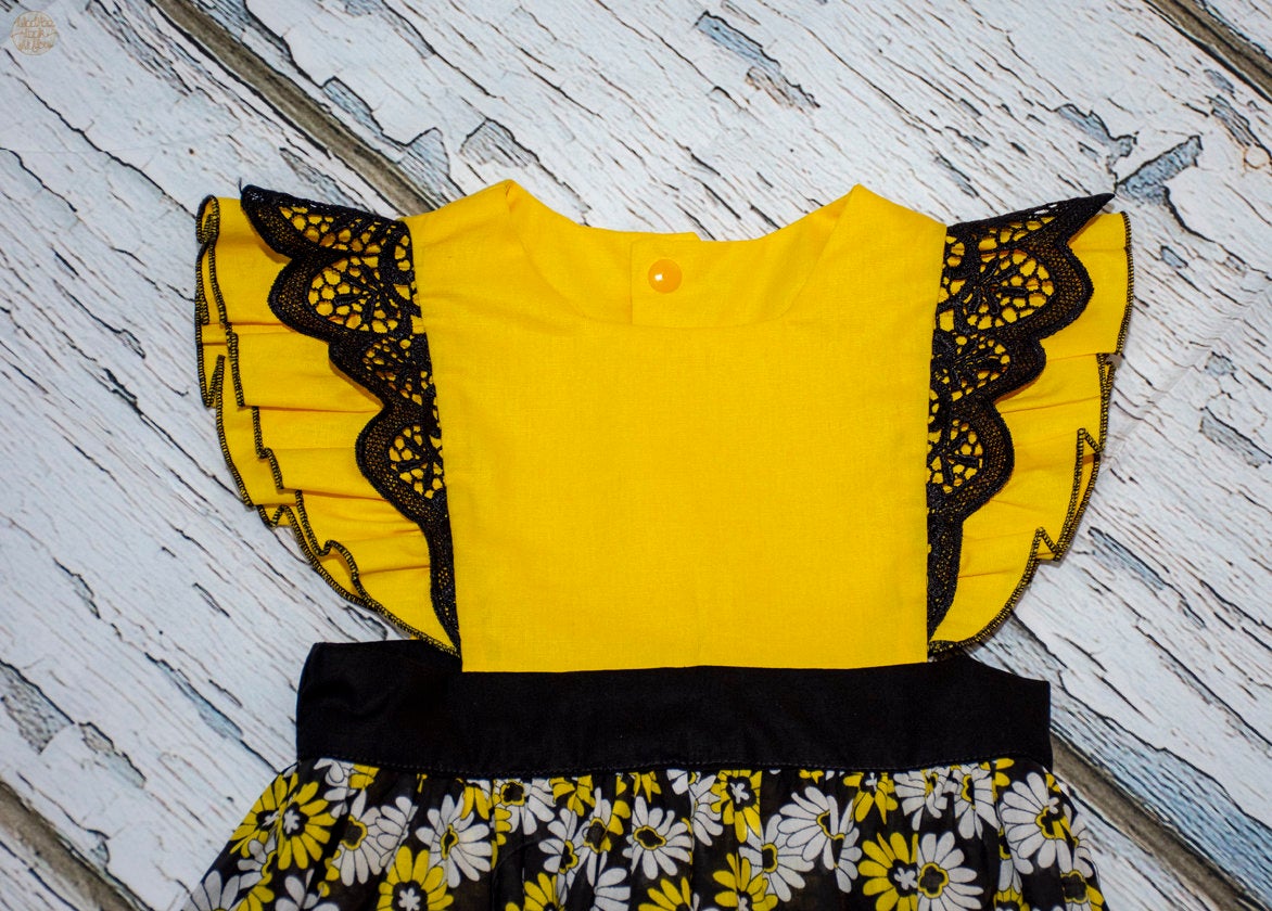 Gorgeous young girl's pinafore that would make any girl feel pretty and playful. Suitable for warm summer outing or in autumn with a long sleeve top underneath. Skirt is a full circle, with a pretty yellow and whitedaisy print and is made of 100% premium cotton. The gathered skirt on a fitted waistband is attached to a yellow square neckline bodice also in 100% cotton. The pinafore has snap button closing in matching colours at the back. It is trimmed beautifully with a delicate, black lace flutter over a yellow ruffle on the shoulder. This garment has been handmade with greatest attention to detail in finishing. It's easy care, with cold machine wash and low iron.