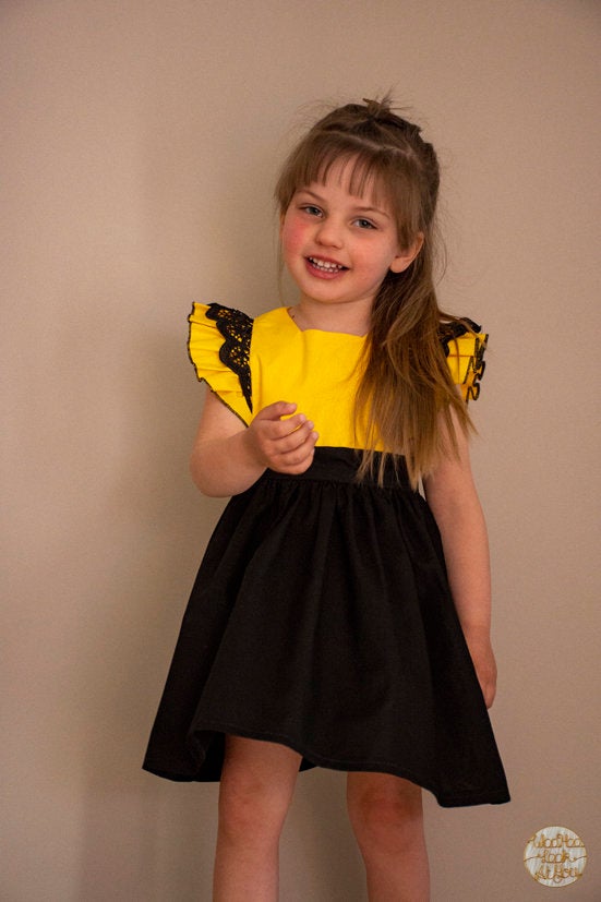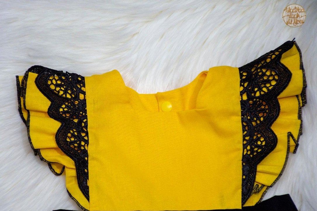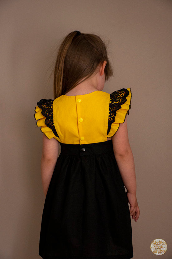 Dress - Pinafore - Emma Polly Yellow and Black with Black Lace Trim