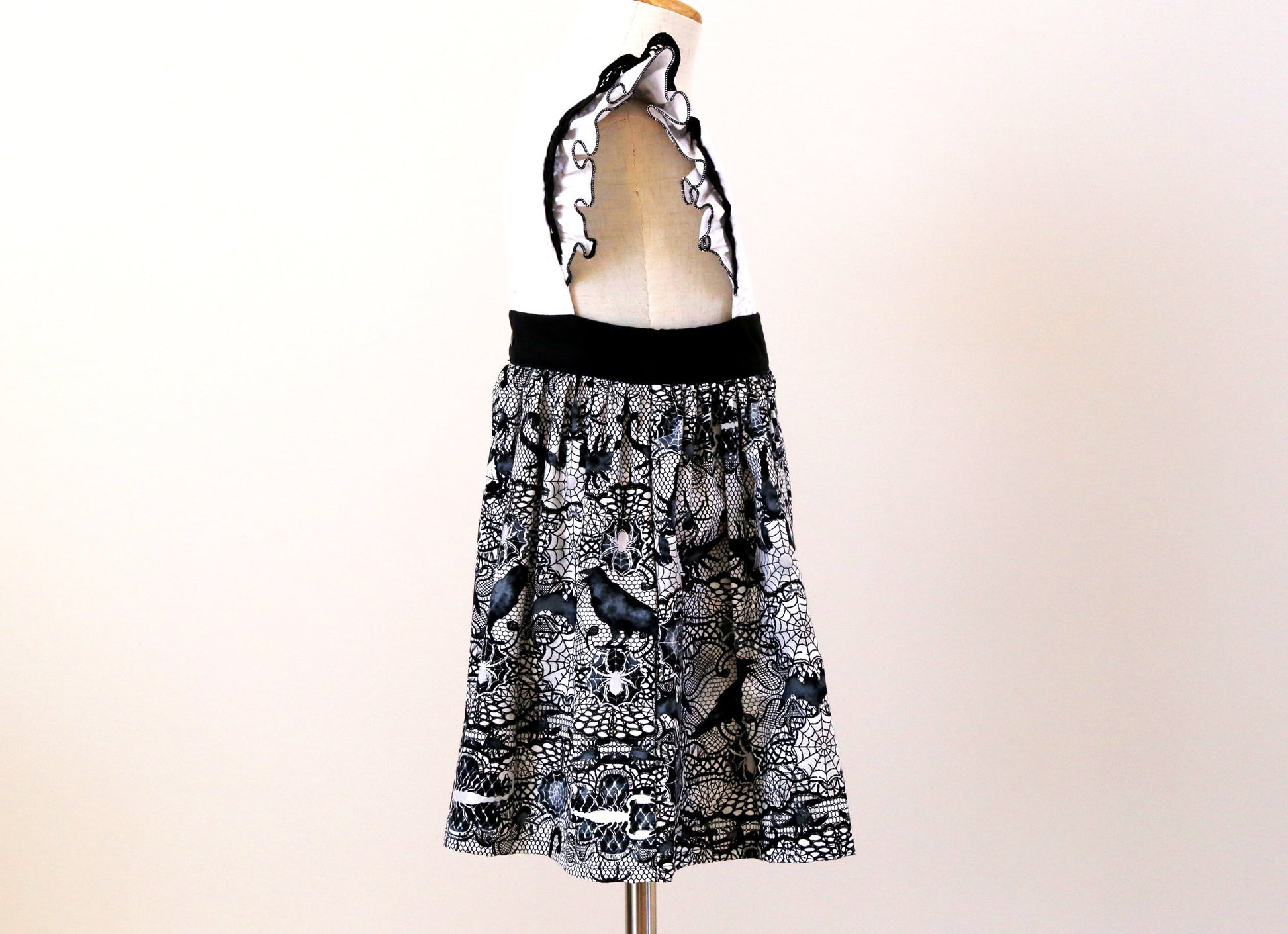 - White bodice, white background with spiderwebs, scorpions and crows print fabric
